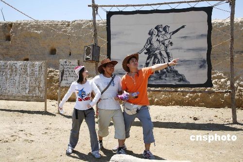 2008年7月17日晚,為期5天的臺(tái)灣學(xué)生西部“中華文化尋根夏令營(yíng)”圓滿結(jié)束,上海中醫(yī)藥大學(xué)的35位臺(tái)灣學(xué)生返滬。他們?cè)趯幭闹摹版?zhèn)北堡西部影城”,了解中國(guó)電影從該地走向世界的歷史。圖為部分臺(tái)灣學(xué)生模仿在大陸家喻戶曉的長(zhǎng)春電影制片廠“工農(nóng)兵”片頭之景。 中新社發(fā) 潘索菲 攝