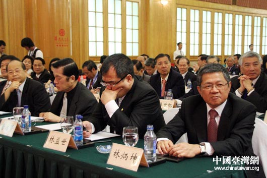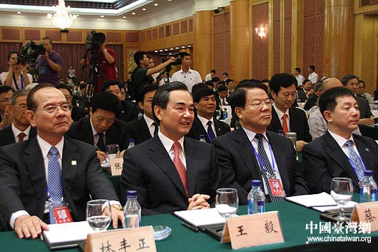 第五屆兩岸經(jīng)貿(mào)文化論壇專題報(bào)告7月11日上午在長沙舉行,圖為中共中央臺(tái)辦主任王毅(前排左二)和中國國民黨副主席林豐正(前排左一)等出席。(中國臺(tái)灣網(wǎng) 鐘寶華 攝)