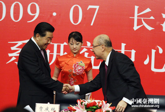 中共中央政治局常委、全國政協(xié)主席賈慶林在第五屆經貿文化論壇開幕式上發(fā)表講話,并提出全面推進和深化兩岸文化教育交流合作的五點建議。講話結束后,吳伯雄起身上前同賈慶林主席握手表示敬意。(中國臺灣網 鐘寶華 攝)
