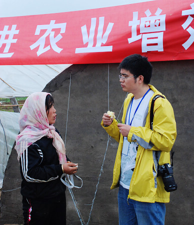 網(wǎng)媒記者采訪拱棚示范園區(qū)的婦女。