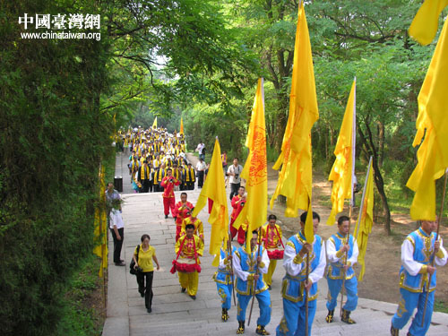 海峽兩岸文化界人士在祭祀樂隊的引領(lǐng)下緩步登上橋山 (中國臺灣網(wǎng) 蕪?fù)?攝)