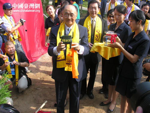在一棵小樹前,參加“情系長安——兩岸文化聯(lián)誼行”活動的臺灣嘉賓團長程建人與榮譽團長焦仁和,分別拿出了專程從臺灣帶來的阿里山的土和日月潭水,輕輕倒進樹坑中,寓意兩岸同胞同根同祖、一脈相承,中華文化源遠(yuǎn)流長,萬古長青。阿里山土與日月潭水倒入黃陵的土中后,馬上與橋山黃陵的泥土混為一色,分不出哪是來自臺灣的土,哪是黃陵的土。