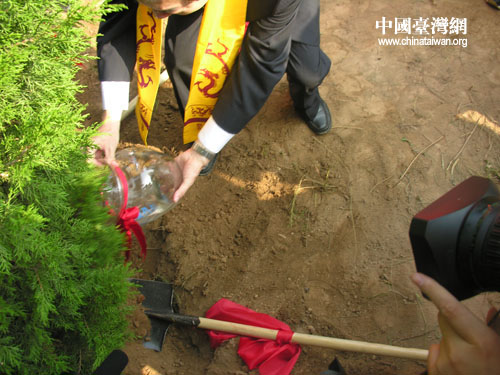 焦仁和把專程從臺灣帶來的日月潭水輕輕倒進樹坑中。(中國臺灣網(wǎng) 蕪?fù)?攝)