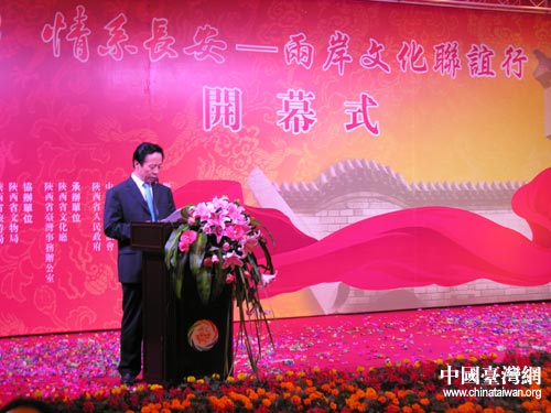 陜西省副省長(zhǎng)鄭小明在開幕式上指出,陜西是中華民族和華夏文明的重要發(fā)祥地,西安是古代絲綢之路的起點(diǎn),世界著名的古都和歷史文化名城,近年來的陜臺(tái)間文化交流活動(dòng)十分活躍,秦始皇兵馬俑展、陜西文物精華展、漢陽陵文物展、法門寺佛指舍利赴臺(tái)供奉等一系列活動(dòng),加深了兩岸同胞間的了解,增進(jìn)了同胞情誼。他代表陜西3780萬人民熱情歡迎來自海峽兩岸的文化界嘉賓。