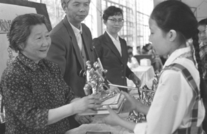 1991年6月1日,全國勞動模范、著名小學教師斯霞在為江蘇南京師范大學附屬小學優(yōu)秀學生發(fā)獎。斯霞1956年加入中國共產(chǎn)黨。1922年就讀于杭州女子師范學校。1927年畢業(yè)后,先后在浙江紹興、嘉興、蕭山、杭州及江蘇南京等地小學任教。上世紀五十年代,她創(chuàng)造出“字不離詞、詞不離句,句不離文”的小學語文隨課文分散識字教學法,大面積、高效率地提高了識字教學的質(zhì)量。她教的學生在兩年內(nèi)就認識了2000多個漢字,讀了174篇課文,在當時國內(nèi)小學教育界首屈一指。六十年代,經(jīng)專家學者總結(jié)、論證,斯霞的“以語文教學為中心,把識字、閱讀、寫話三者結(jié)合起來”的小學語文教學法,在全國產(chǎn)生廣泛影響。2004年1月12日,斯霞在南京逝世,享年94歲。 |