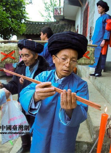 押禮先生手拈檀香拜祭祖靈,袖戴帶紅花的新郎在臺階上等候。(中國臺灣網(wǎng) 陳佳慧 攝)