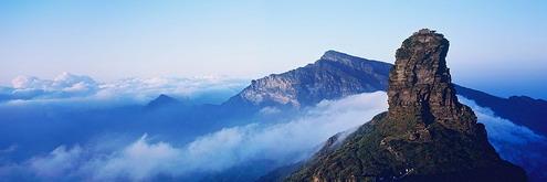 梵凈山很奇特、險峻,尤其引人入勝的是新金頂,在海拔約2200余米的崇山峻嶺上,突起一個山峰,像陽朔的丹霞一樣,但是,只有一個,高約100米,如巨筍出土,常常紅云環(huán)繞(哈蘇6x6的片子有反映,另貼),直插蒼宇,令人震撼。1618年,奉圣旨立碑曰:“眾名岳之宗”,可見梵凈山在皇帝眼里的位置了。