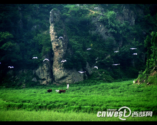 【注釋】嶙峋:突幾。千尋:喻極高。古時八尺為一手。紀之以詩:指白居易寫的《仙娥峰下作》一詩中。良有以也:確實有其緣故。此景今在商州市二龍山水庫西壁.