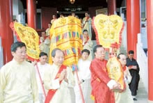 媽祖靈身在8位師父進(jìn)行誦經(jīng)和灑凈儀式后,由主祭在其他陪祭和儀仗隊陪同下,移駕至主要祭拜處,供善信祭拜。