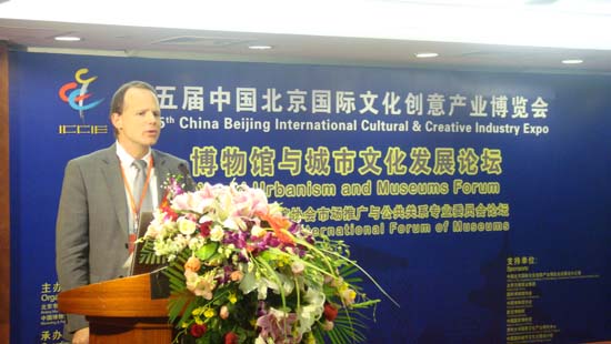 第五屆文博會(huì)——2010博物館與城市發(fā)展論壇11月5日上午在北京新聞大廈舉辦,聯(lián)合國(guó)教科文組織國(guó)際博物館協(xié)會(huì)MPR主席Paal Mork、中國(guó)博物館協(xié)會(huì)市場(chǎng)推廣與公共關(guān)系專(zhuān)業(yè)委員會(huì)主席 閆宏斌等來(lái)自歐洲、美洲、澳洲、非洲、亞太、港澳臺(tái)地區(qū)及中國(guó)大陸的博物館界、學(xué)術(shù)界、企業(yè)界的專(zhuān)家學(xué)者、社會(huì)人士參加。文博會(huì)組委會(huì)副秘書(shū)長(zhǎng)、北京市文物局局長(zhǎng)孔繁峙、文博會(huì)組委會(huì)辦公室副主任、北京市貿(mào)促會(huì)副會(huì)長(zhǎng)儲(chǔ)祥銀等到會(huì)致辭。