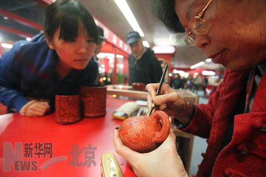 11月18日,參觀者在北京文博會上觀看藝人現(xiàn)場制作北京雕漆工藝品。