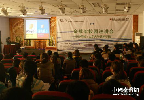 中國(guó)臺(tái)灣網(wǎng)3月28日濟(jì)南消息 由旺旺中時(shí)媒體集團(tuán)、中國(guó)商務(wù)廣告協(xié)會(huì)、山東大學(xué)共同舉辦的第22屆金犢獎(jiǎng)巡講會(huì)山東站于3月27日在山東大學(xué)藝術(shù)學(xué)院報(bào)告廳舉行,同時(shí)舉辦了第21屆時(shí)報(bào)金犢獎(jiǎng)獲獎(jiǎng)作品展覽。濟(jì)南市委臺(tái)辦巡視員謝愛(ài)民應(yīng)邀參加了巡講會(huì)。