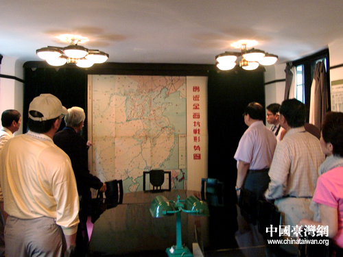 兩岸學(xué)者在抗戰(zhàn)時(shí)期蔣介石辦公地云岫樓“全面抗戰(zhàn)形勢圖”前駐足觀看