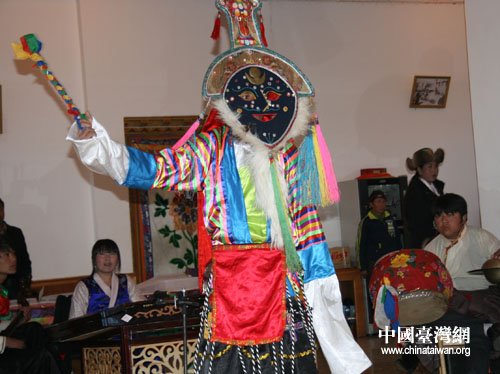 藏戲是一個非常龐大的劇種系統(tǒng),由于青藏高原各地自然條件、生活習俗、文化傳統(tǒng)、方言語音的不同,它擁有眾多的藝術品種和流派。西藏藏戲是藏戲藝術的母體,藏戲的藏語名叫“阿吉拉姆”,意為“仙女姐妹”。據(jù)傳藏戲最早由七姊妹演出,劇目內(nèi)容又多是佛經(jīng)中的神話故事,故而得名。藏戲起源于8世紀藏族的宗教藝術。17世紀時,從寺院宗教儀式中分離出來,逐漸形成以唱為主,唱、誦、舞、表、白和技等基本程式相結合的生活化的表演。藏戲唱腔高亢雄渾,基本上是因人定曲,每句唱腔都有人聲幫和。(中國臺灣網(wǎng) 董潔 攝)
