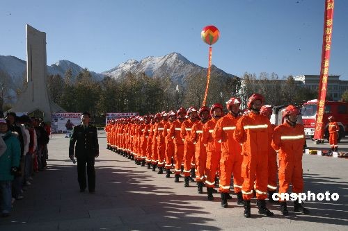 圖為擔(dān)負(fù)消防、救災(zāi)等任務(wù)的西藏救援武裝力量首次集體亮相
