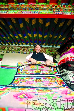 資料圖片:圖為日喀則地區(qū)江孜縣江孜鎮(zhèn)江嘎村的邊倉(cāng)老阿媽在自家寬敞明亮的藏式新房里鋪卡墊,布置美好新生活(資料圖片)。 旦增 攝(圖片來(lái)源:《西藏日?qǐng)?bào)》)