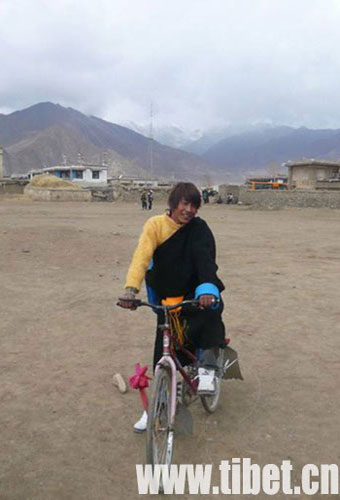 騎著自行車的藏族小伙子來到村中廣場!z影:曲曉麗