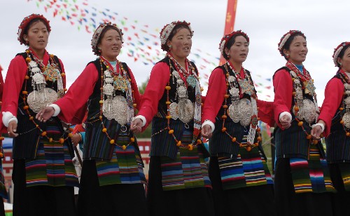 資料圖片:2007年8月26日,西藏日喀則農(nóng)民表演當(dāng)?shù)孛耖g舞蹈。當(dāng)日上午,日喀則地區(qū)第七屆珠峰旅游文化節(jié)在日喀則市扎寺文化廣場(chǎng)開幕。 新華社記者 索朗羅布攝