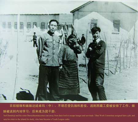 在第二展廳,一組農(nóng)奴今昔對比的照片格外引人注目。民主改革前,農(nóng)奴頓珠和妹妹達(dá)娃卓瑪每天都要忍受饑餓和差役。民主改革后,妹妹被送到內(nèi)地學(xué)習(xí),后來成為團(tuán)干部。幾十年過去了,頓珠從工作崗位上退了下來,妹妹已成為祖母,一家人過著美滿的生活。
