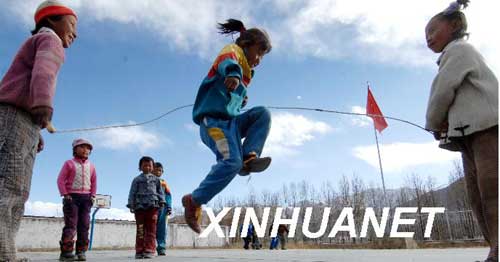 資料圖片:2007年11月21日,西藏堆龍德慶縣羊達(dá)鄉(xiāng)通嘎村教學(xué)點(diǎn)的學(xué)生們?cè)谡n間跳繩。新華社記者 格桑達(dá)瓦 攝