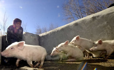 資料圖片:西藏山南地區(qū)乃東縣克松村的村民卓嘎在喂豬(2008年12月15日攝)。新華社記者 普布扎西攝