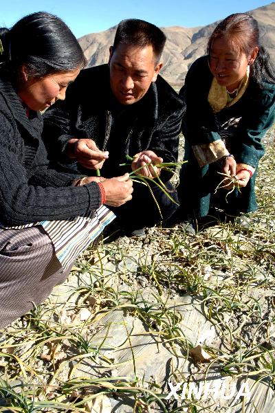資料圖片:2006年12月5日,西藏乃東縣的兩位農(nóng)民在種藏蒜能手嘎多次仁(中)的指導(dǎo)下學(xué)習(xí)大蒜種植經(jīng)驗。新華社記者 索朗羅布 攝