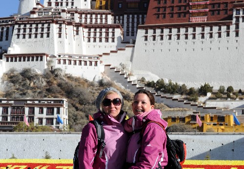 資料圖片:4月5日,兩名來自德國的游客在拉薩布達拉宮前合影。 新華社記者 覺果 攝