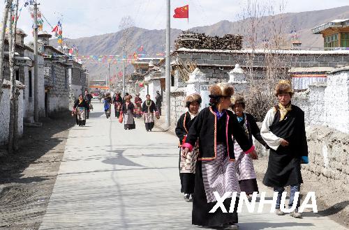 資料圖片:克松村村民走在寬敞的水泥路上(3月23日攝)。新華社記者 格桑達(dá)瓦 攝