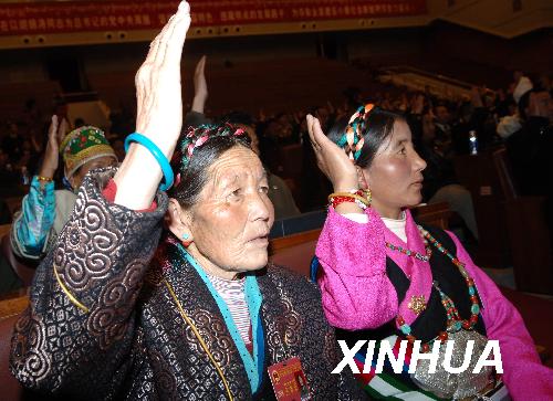 資料圖片:這是西藏人大代表在舉手表決通過政府工作報(bào)告(2008年1月22日攝)。新華社記者 索朗羅布 攝