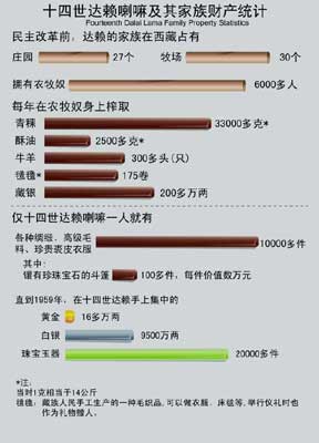 民主改革前,十四世達(dá)賴家族在西藏占有27座莊園、30個(gè)牧場(chǎng),擁有農(nóng)奴6000多人。每年在農(nóng)奴身上榨取青稞33000多克(1克相當(dāng)于14公斤)、酥油2500多克、藏銀200多萬(wàn)兩、牛羊300頭、氆氌175卷。1959年,十四世達(dá)賴?yán)锉救耸稚嫌悬S金16萬(wàn)兩、白銀9500萬(wàn)兩、珠寶玉器2萬(wàn)多件,有各種綢緞、珍貴裘皮衣服1萬(wàn)多件,其中價(jià)值數(shù)萬(wàn)元的鑲有珍珠寶石的斗篷100多件。作為舊西藏最大的農(nóng)奴主十四世達(dá)賴的累累罪惡罄竹難書——