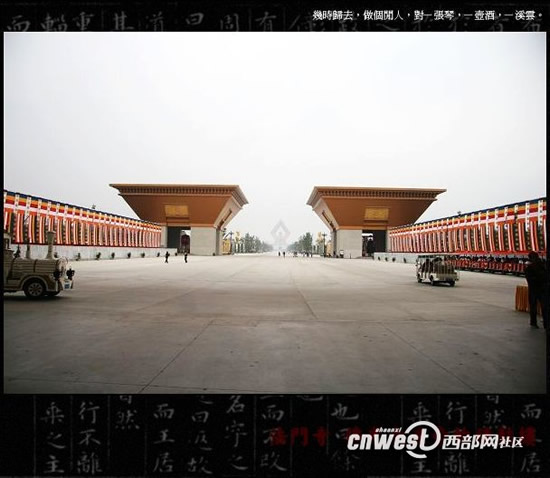 148米的法門寺合十舍利塔于2009年5月9日落成。其造型如同合十的雙手,中間鏤空部分是一座傳統(tǒng)形式的唐塔。塔前鋪設了一條長達1230米、寬108米的佛光大道,一些源于佛教經(jīng)典題材的景觀小品及金色菩薩像點綴在大道兩側。大道兩頭分別是可容十萬人的朝圣廣場與山門廣場。(網(wǎng)友:樂拍智障 更多圖片>>)