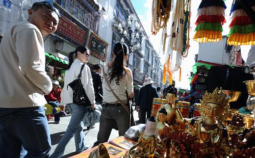 幾名游客從拉薩八廓街上的商鋪旁經(jīng)過(6月9日攝)。新華社記者格桑達(dá)瓦攝