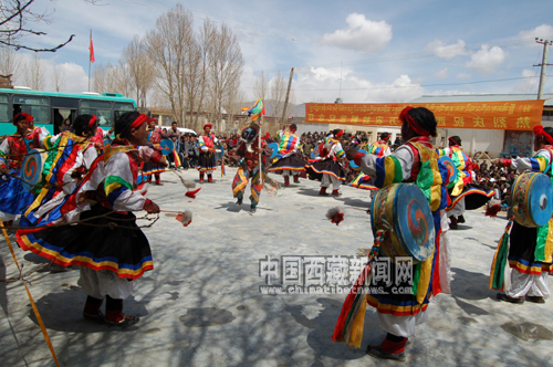 近日,日喀則市司馬卓鼓舞、扎西吉彩金銀銅器制作技藝、江洛康薩青稞酒制作技藝、朋必涼粉制作技藝通過自治區(qū)驗(yàn)收,被列為第三批自治區(qū)級(jí)非物質(zhì)文化遺產(chǎn)保護(hù)名錄。目前,初三賽馬節(jié)、后藏藏歷新年正在申報(bào)之中。圖為日喀則市甲措雄鄉(xiāng)司馬卓鼓舞農(nóng)民演員在表演古老的司馬卓鼓舞。巴喬 攝