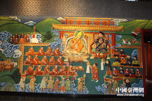進(jìn)門之后,映入眼簾的是一幅大型浮雕壁畫(huà),描述了五世達(dá)賴?yán)锔熬┯P見(jiàn)順治皇帝的場(chǎng)景。(中國(guó)臺(tái)灣網(wǎng) 李典典攝)