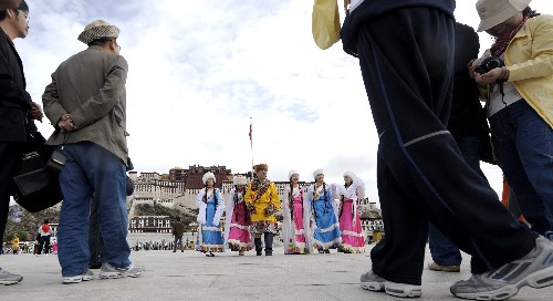 資料圖片:7月29日,來自內(nèi)地的游客在布達拉宮廣場前留影。新華社記者 普布扎西 攝