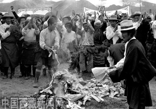資料圖片:1959年,西藏翻身作了主人的農(nóng)奴以燒地契的方式來(lái)慶祝自己的解放。(圖片來(lái)源:西藏日?qǐng)?bào)/中國(guó)西藏新聞網(wǎng))