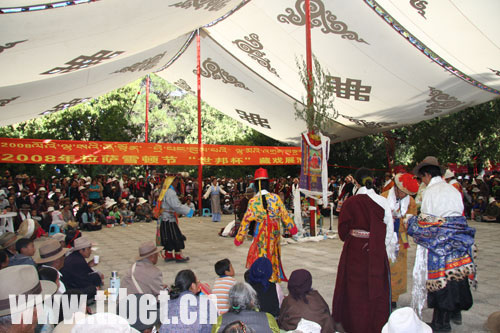 資料圖片:隨著雄勁的鼓鈸聲響,2008中國拉薩雪頓節(jié)藏戲匯演在羅布林卡拉開序幕,圖為演出現(xiàn)場。扎西平措 攝(圖片來源:中國西藏信息中心)