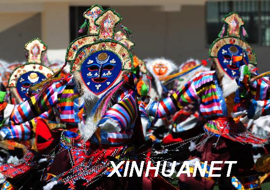 具有600多年歷史的藏戲被譽(yù)為“西藏文化活化石”。藏戲是以歌舞形式表現(xiàn)故事內(nèi)容的綜合表演藝術(shù),與宗教有著深厚的淵源,并受到中原文化和印度文化的影響。藏戲主要是在宗教節(jié)日、民間喜慶場合演出。藏戲中使用的面具造型多樣,生動(dòng)傳神,服飾豐富多彩,具有鮮明的雪域高原特色。