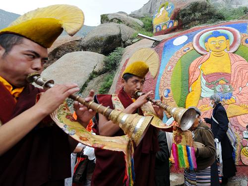 資料圖片:8月20日,拉薩色拉寺僧人在展佛儀式上吹響法號。新華社記者 覺果 攝