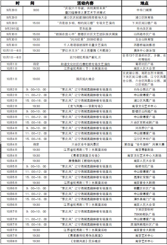 從9月29日開始,一直到10月8日,國(guó)慶節(jié)長(zhǎng)假期間的多項(xiàng)文化活動(dòng)輪番上演:9月29日起至十一期間,在市內(nèi)及區(qū)縣舉行花車巡游;10月1日19:00,在玄武湖公園、雨花臺(tái)烈士陵園、下關(guān)區(qū)閱江樓公園、江寧區(qū)鳳凰臺(tái)公園、六合區(qū)鳳凰山公園、浦口區(qū)明發(fā)廣場(chǎng)等處舉行國(guó)慶焰火晚會(huì);10月1日—8日的每天晚上,在全市13個(gè)區(qū)縣的社區(qū)、鄉(xiāng)鎮(zhèn)、農(nóng)村等場(chǎng)所,將有《開國(guó)大典》、《我的長(zhǎng)征》、《太行山上》、《紅旗飄飄》等近70部?jī)?yōu)秀國(guó)產(chǎn)獻(xiàn)禮片;10月2日—7日,在市內(nèi)多個(gè)地方,將有“東北風(fēng)”遼寧海城高蹺秧歌專場(chǎng)演出。