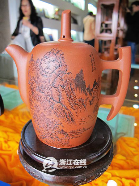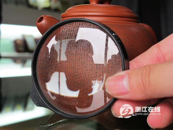 在這些紫砂壺中,最讓人稱奇的是一把茶壺上刻了3000多字。這件作品是紫砂專家、浙江省民間工藝美術(shù)大師吳偉華的杰作,而這種在紫砂上進(jìn)行微雕的技術(shù),也是他近年來(lái)的獨(dú)創(chuàng)。