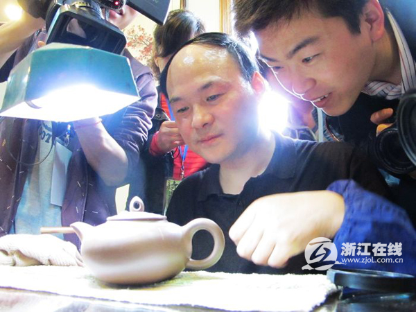 在工作室里,擺放著各式各樣的紫砂壺,精湛的工藝,細(xì)膩的花紋,都讓人嘖嘖稱贊。“這不是茶具,簡(jiǎn)直就是一件件精美的工藝品”,人民網(wǎng)的李璐穎捧著紫砂壺愛不釋手。