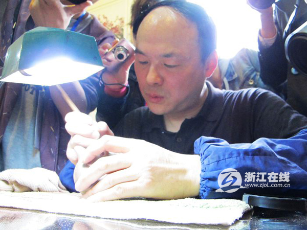 浙江在線長(zhǎng)興4月26日訊 (記者 童俊) 拳頭大的一把茶壺上能刻下3000多個(gè)字?你相信么?這并非奇談。26日上午,參加“詩(shī)畫江南——全國(guó)知名網(wǎng)絡(luò)媒體浙江行”的網(wǎng)記們?cè)陂L(zhǎng)興縣的吳偉華紫砂壺工作室親眼目睹了這一絕活。