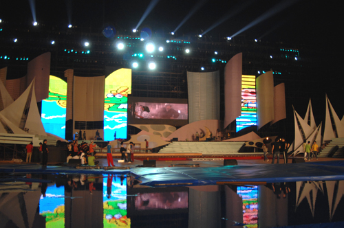 央視秋晚是近年來 “中華情”在日常歌會之外承辦的重要主題晚會。從2004年在上海浦江畔舉辦的“浦江月·中華情”到2005年在武漢黃鶴樓腳下舉辦的“江城月·中華情”,一直在戶外舉辦的秋晚日益形成了自己的藝術(shù)風格。景觀舞美便是這眾多藝術(shù)風格中最閃亮、最奪目的一點,也是2005年“江城月·中華情”獲得國際大獎的重要原因。不知大家是否還記得2004年浦江畔那艘蓄勢待發(fā)的帆船,以及2005年黃鶴樓腳下再現(xiàn)的瓊樓玉宇,秋晚的舞臺成為中華民族地緣文化符號的藝術(shù)再現(xiàn),給全球華人留下了深刻印象。