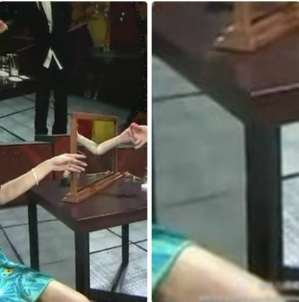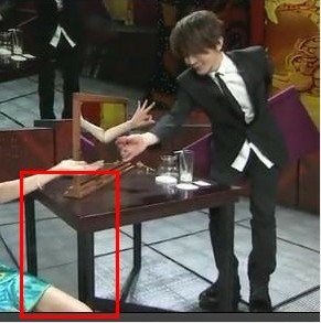 ohdarlin:這很簡單。桌子下面其實有個鏡子,就是說實際上只有一半位置是空間,另一半是個三角形的箱子,里面藏了人。你們注意看劉謙一開始做的那個位置桌子下面的顏色怪怪的。