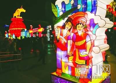 人海,燈廊。背襯著流光溢彩的廈門夜景,徐來的湖風(fēng)中,人們在瑰麗的彩燈前展顏歡笑、合影留念,感受新春佳節(jié)的喜慶氣氛。燈會(huì)以“輝煌30年”為主題,突出展示海峽兩岸經(jīng)濟(jì)文化交流成果,通過現(xiàn)代科技與傳統(tǒng)燈藝的完美結(jié)合,呈現(xiàn)出一派“火樹銀花不夜天,花燈璀璨慶和諧”的瑰麗景象。正如副市長裴金佳在致辭中所說,燈會(huì)集中展示了廈門改革開放30年來,全市上下一心,貫徹落實(shí)科學(xué)發(fā)展觀,搶抓機(jī)遇,開拓奮進(jìn),在經(jīng)濟(jì)社會(huì)建設(shè)發(fā)展中取得的豐碩成果,表達(dá)了全市人民繼續(xù)吹響時(shí)代的號(hào)角、決心把廈門建設(shè)得更加美好的堅(jiān)定信念和歡慶盛世、歌頌憧憬美好幸福生活的喜悅心情,預(yù)示著廈門在新的一年里,經(jīng)濟(jì)社會(huì)各項(xiàng)事業(yè)發(fā)展必將“牛氣沖天”。