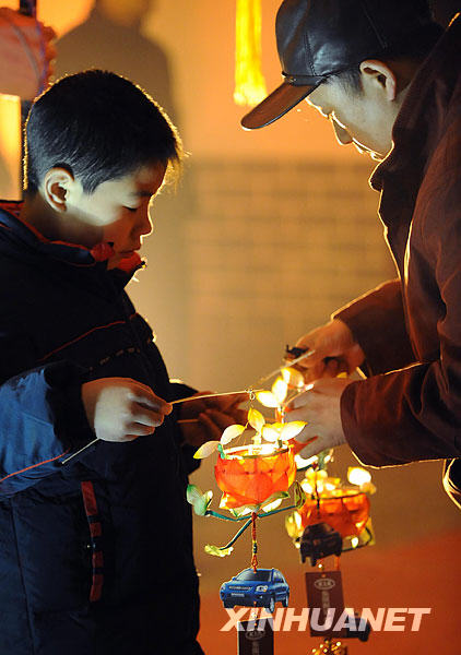 2月7日,在中華門上燈活動現(xiàn)場,市民給孩子點亮花燈。