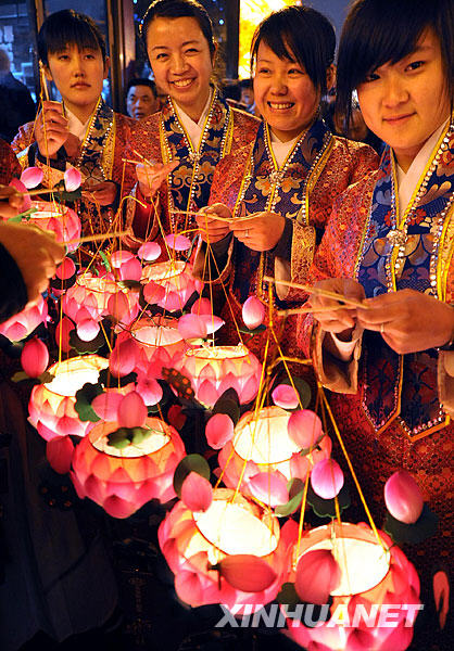 2月7日,身著古裝的工作人員準備給游人贈送荷花燈。新華社記者孫參攝